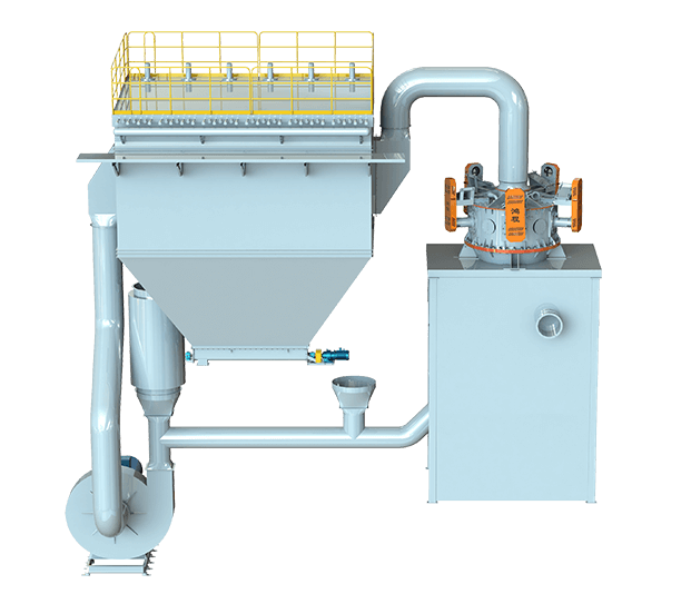 开路系统:物料通过给料机定量进入进料管道,与系统进风混合均匀后,由下端入料口进入分级机,符合粒径要求的细颗粒随气流进入脉冲收集器,粗颗粒夹带部分细颗粒沿筒壁下降至二次风处,经二次风的淘洗作用,使粗细颗粒分离,细颗粒上升至分级区进行二次分级,粗颗粒下降至下料口排出。