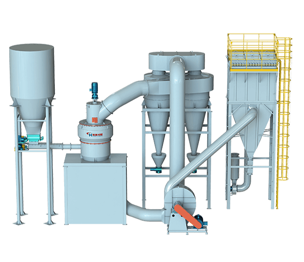 闭路系统:物料通过给料机定量进入进料管道,与系统进风混合均匀后,由下端入料口进入分级机,符合粒径要求的细颗粒随气流进入旋风收集器,经收集细粉后的气流再次回到分级机,形成闭路,循环的气流一部分进入余风脉冲,经除尘后排出,粗颗粒夹带部分细颗粒沿筒壁下降至二次风处,经二次风的淘洗作用,使粗细颗粒分离,细颗粒上升至分级区进行二次分级,粗颗粒下降至下料口排出。